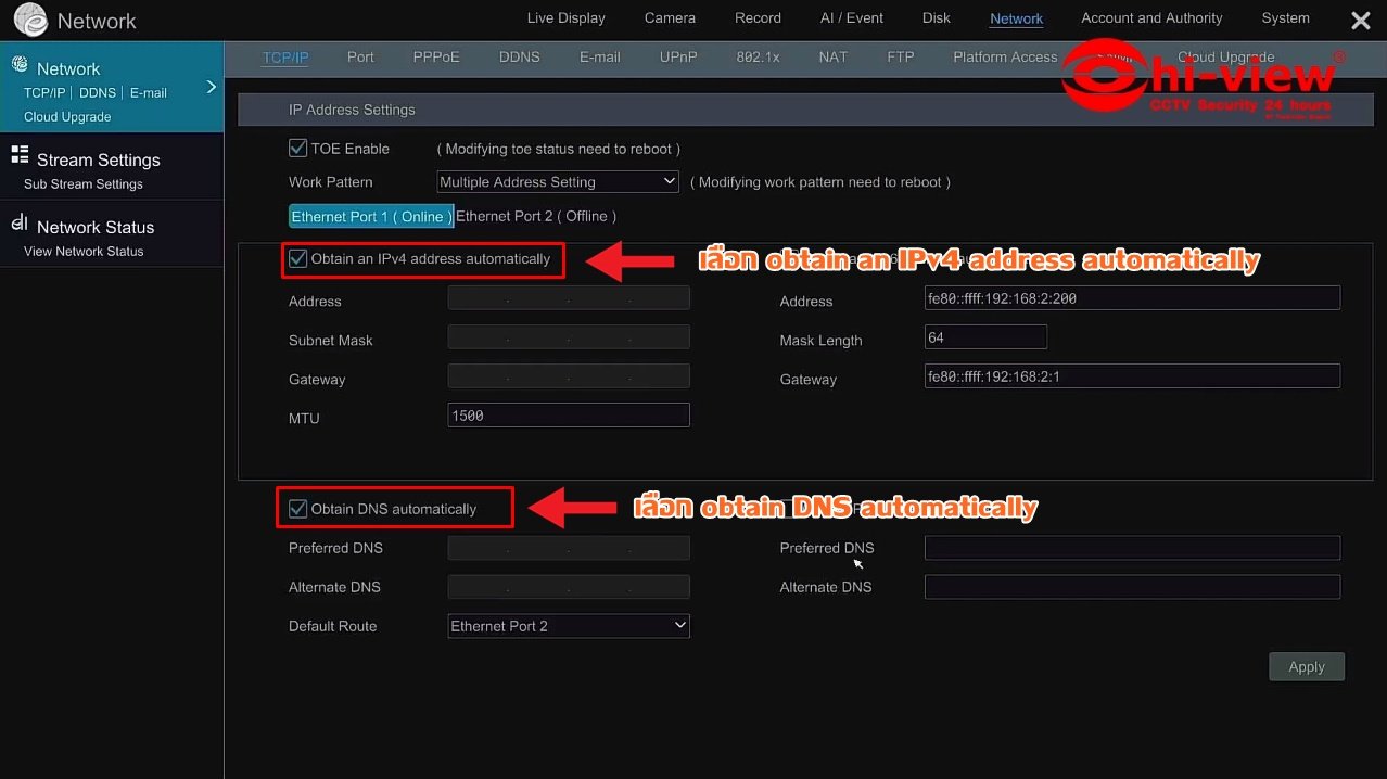 6. เลือกตัวเลือก Obtain an IPv4 address automatically และ Obtain DNS automatically