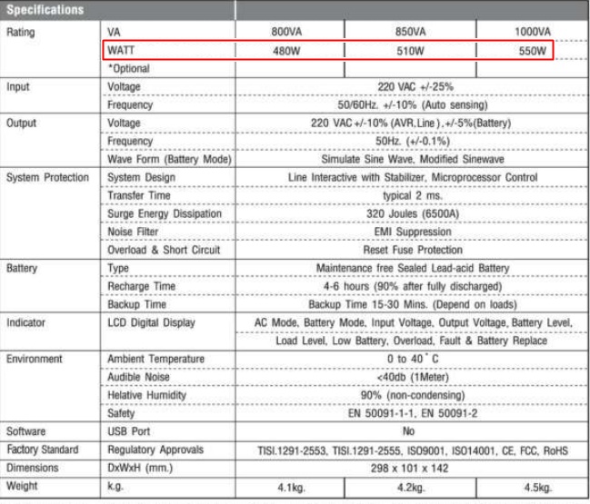 ตัวอย่างสเปคของเครื่องสำรองไฟ ให้ดูตรงช่อง WATT ว่าเราจะใช้ขนาดเท่าไร ให้พอกับที่เราคำนวณออกมา