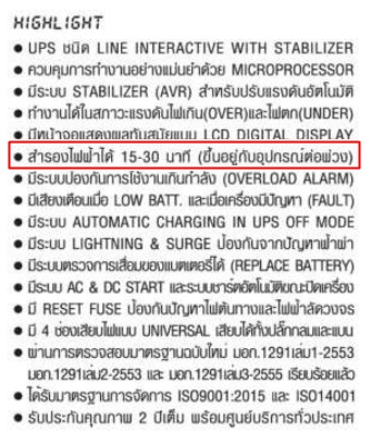 ในสเปคเขาก็จะบอกเราเลยว่าถ้าใช้รุ่นนี้จะสำรองไฟได้นานเท่าไร (มันจะไม่เป๊ะนะคะ ด้วยหลายปัจจัย)